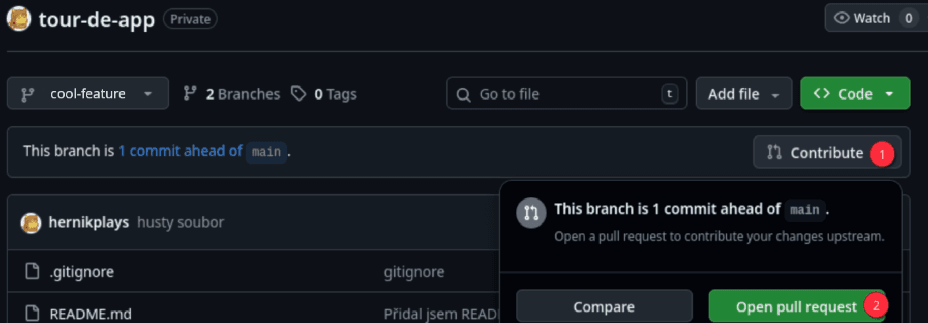 In your GitHub repository, switch to the branch you want to merge. Below the branch selection, you’ll see information about how many commits this branch is ahead or behind compared to the main branch. To create a PR, click Contribute → Open pull request.