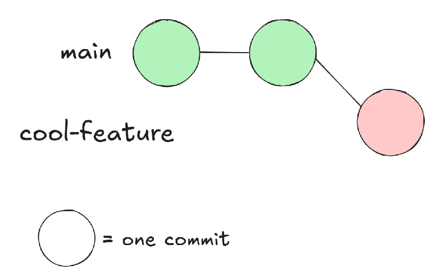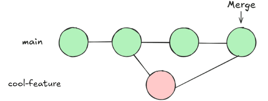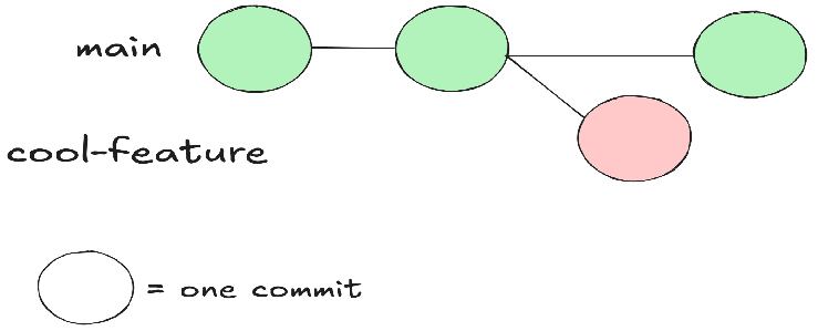 To merge the changes from the cool-feature branch back into main, we first need to include the changes that were made in main into cool-feature. When we look at our pull request, which we created a moment ago, instead of a green checkmark, we’ll now see the following message:
