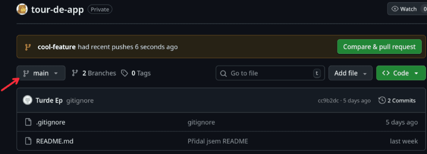That means we’ve successfully uploaded our change to another branch. To view it, simply click the branch name shown in the yellow label, or open the branch dropdown menu (as shown by the arrow) and select it there.