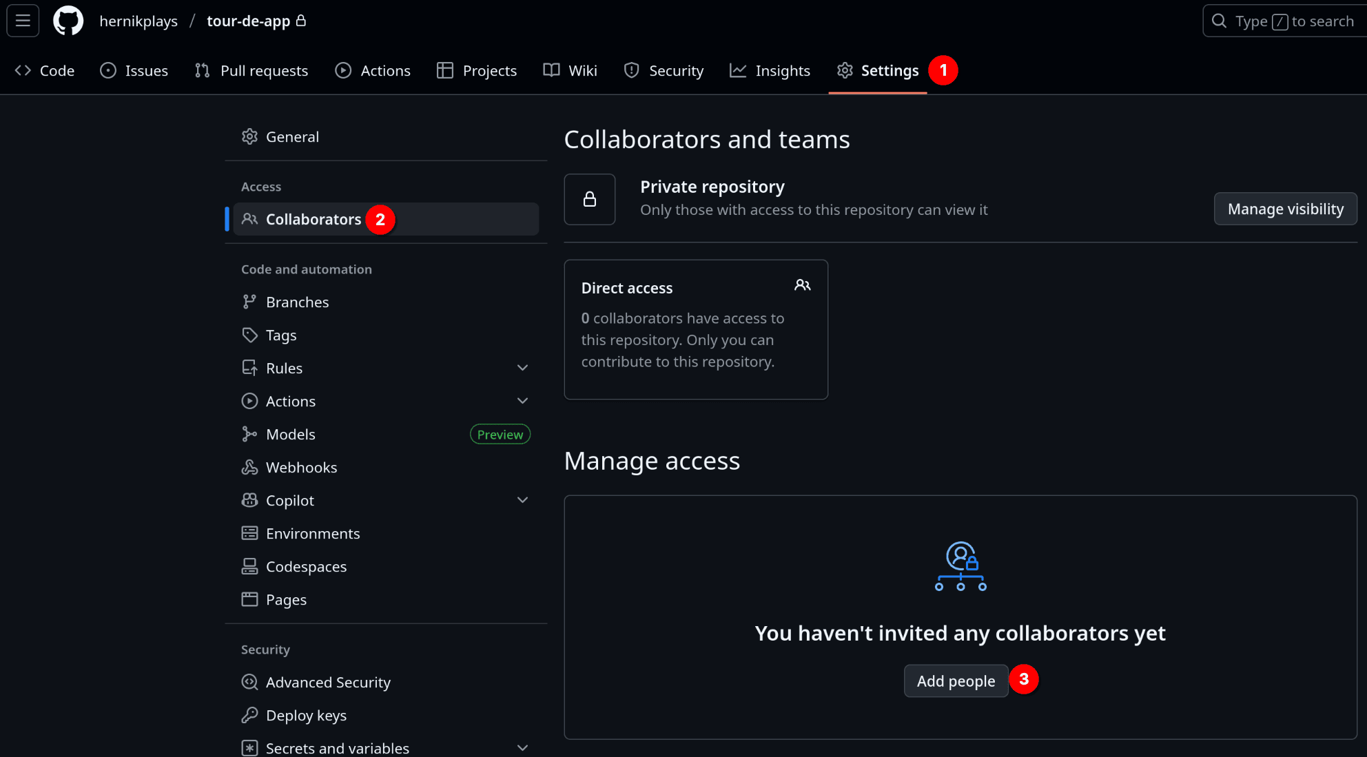 Finally, you’ll want to add other members of your team. At the top of the page, open Settings, then go to the Collaborators section and add the GitHub profiles of your teammates.
