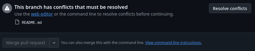 Because there are conflicts that can’t be automatically resolved without losing some changes, we’ll have to fix them manually. GitHub provides a web editor to help resolve conflicts, but in larger projects it can get confusing, so let’s take a look at how to resolve them locally instead.